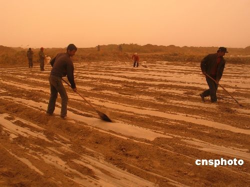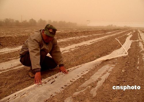 4月16日下午1點30分左右,距離新疆喀什市300多公里外的新疆生產(chǎn)建設(shè)兵團(tuán)農(nóng)三師小海子墾區(qū),遭遇沙塵暴侵襲,能見度一度不足50米,部分已經(jīng)出苗的棉田滴灌帶和地膜遭到破壞。肆虐的沙塵暴給當(dāng)?shù)鼐用裆a(chǎn)生活、交通以及春耕春播工作帶來不利影響。據(jù)新疆氣象部門介紹,當(dāng)天新疆喀什地區(qū)莎車、澤普、麥蓋提、葉城四縣遭遇短時沙塵暴天氣,一些縣城能見度不足600米,最大風(fēng)速達(dá)16米每秒。中新社發(fā) 肖妮娟 攝