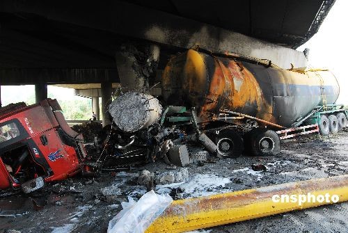 4月17日凌晨,在湖南郴州市郴資桂高等級(jí)公路與京珠高速公路交叉處,一輛水泥槽罐車(chē)由東往西方向行駛,因貨車(chē)司機(jī)疲勞駕駛撞上京珠高速主線由南往北橫跨郴資桂大橋(K490+200北上)的橋墩上,造成貨車(chē)起火,兩根立柱斷裂,一根立柱受損,該大橋橫梁塌落,往北方向的橋面塌陷,京珠高速公路耒宜段郴州至良田被迫中斷交通。肇事車(chē)輛上1人死亡,1人受傷,1人逃逸。事故發(fā)生后,湖南省郴州市、省交通廳、省高速公路管理局領(lǐng)導(dǎo)立即趕赴現(xiàn)場(chǎng),指導(dǎo)現(xiàn)場(chǎng)處置、交通救援和事故處理,做好保安全、保暢通、保穩(wěn)定工作。上午10時(shí)南行線通車(chē),下午14時(shí),單幅雙向間斷恢復(fù)通車(chē)。目前,省市有關(guān)部門(mén)正在緊急進(jìn)行橋梁的加固搶修,防止橋面整體坍塌。事故原因進(jìn)一步調(diào)查和善后處理正在有序進(jìn)行之中。中新社發(fā) 賀茂峰 攝