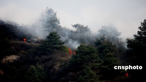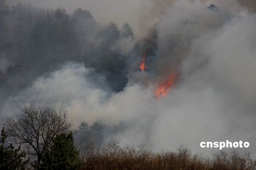 2009年4月17日下午,山西省盂縣上社鎮(zhèn)磨盤村磨盤山發(fā)生森林火災(zāi),因風(fēng)力過大,大火肆虐,整個(gè)森林煙霧彌漫。森林火災(zāi)發(fā)生后,盂縣人民政府和當(dāng)?shù)赜嘘P(guān)部門調(diào)集力量迅速到現(xiàn)場(chǎng)。經(jīng)過緊急撲救,截止下午5時(shí)30分火情已基本得到控制,暫無人員傷亡。目前,起火原因正在調(diào)查中。中新社發(fā) 程瑜