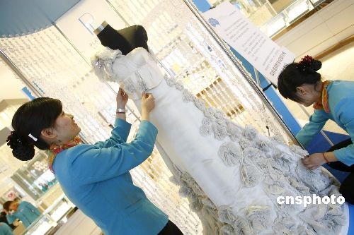 4月26日,世界上僅三件的鉑金婚紗之一亮相北京國華商場,上面墜滿了由鉑金絲線和鉑金珠子縫制的白色花朵,吸引不少顧客的目光。這件價值75萬美元(約合500多萬人民幣)的“金貴”婚紗,是由國際鉑金協(xié)會邀請世界著名設計師Vivienne Tam經(jīng)過近一年時間的創(chuàng)作完成,她巧妙地將中西文化相融合,大膽地將中國的國花——牡丹作為創(chuàng)意元素。圖為工作人員正在整理鉑金婚紗。中新社發(fā) 鄭雄增 攝