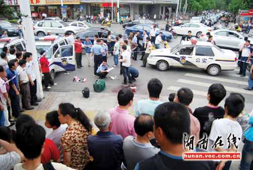 住在離事發(fā)地點100米不到的文冬輝先生看到事發(fā)的全過程:“造成這起血案的人都是在后面的‘一家子菜館’做事的,其中一人脖子上中了一刀,鮮血直冒,被120急救車送往長沙市一醫(yī)院了,兇手逃向市博物館,被博物館的保安當(dāng)場抓獲。”