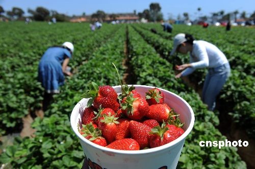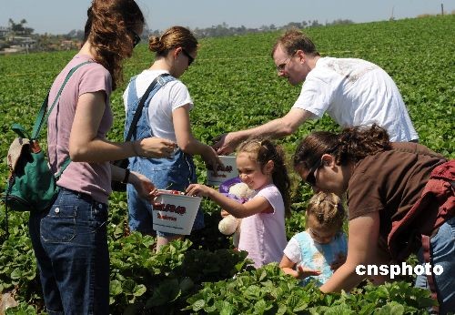 當(dāng)?shù)貢r(shí)間五月二十三日,許多居民來到加州卡爾斯班的草莓田采摘鮮嫩誘人的草莓。當(dāng)天是美國(guó)陣亡將士紀(jì)念日假期的第一天,通常也是美國(guó)民眾出游的日子。據(jù)美國(guó)汽車協(xié)會(huì)預(yù)測(cè),盡管遭遇經(jīng)濟(jì)衰退和甲型H1N1流感疫情,但這個(gè)周末仍有三千兩百多萬(wàn)美國(guó)人出游,比去年同期增長(zhǎng)百分之一點(diǎn)五。中新社發(fā) 張煒 攝