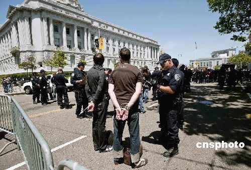 當(dāng)?shù)貢r間5月26日,美國加州最高法院宣布,維持去年十一月四日加州選民通過的禁止同性戀者結(jié)婚的八號提案。法院同時裁決,十一月四日前領(lǐng)取結(jié)婚證書的一萬八千余對同性戀者婚姻合法。最高法院的裁決引起同性戀支持者的強烈不滿,他們在市府大廈前的十字路口靜坐示威,阻擋交通長達(dá)數(shù)小時,警方最后逮捕了一百五十余人。中新社發(fā) 陳鋼 攝