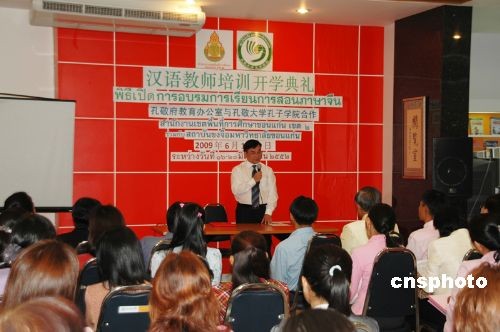 6月16日,泰國(guó)孔敬大學(xué)孔子學(xué)院與泰國(guó)孔敬府教育辦公室合作舉辦的第六屆漢語(yǔ)教師培訓(xùn)班在泰國(guó)開(kāi)班。這是孔敬大學(xué)孔子學(xué)院和孔敬府教育辦公室在今年的第二次合作,是一次特殊的漢語(yǔ)教師培訓(xùn)。以往的教師培訓(xùn)都是在假期進(jìn)行,應(yīng)孔敬府教育辦公室對(duì)提高教師們的漢語(yǔ)水平的迫切需要,孔子學(xué)院在新學(xué)期剛開(kāi)始就為孔敬府各區(qū)縣的中小學(xué)教師開(kāi)設(shè)教師漢語(yǔ)培訓(xùn)課程。來(lái)自孔子學(xué)院的領(lǐng)導(dǎo)、老師、志愿者,孔敬府教育辦公室領(lǐng)導(dǎo)及孔敬府各區(qū)縣19所中學(xué)校的40名教師參加了這次開(kāi)學(xué)典禮。中新社發(fā) 顧時(shí)宏 攝