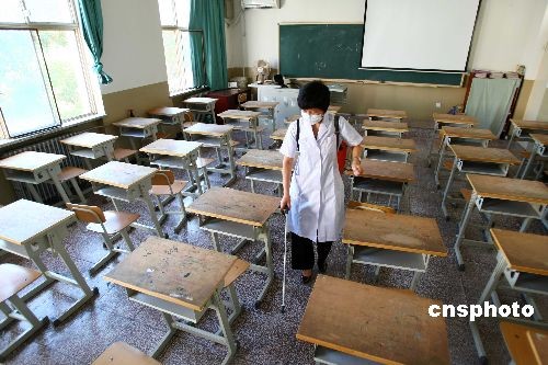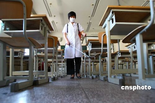 6月22日周一,北京市海淀區(qū)二里溝中心小學(xué)的老師在同學(xué)到來之前為校室進行全面的消毒,嚴防甲型H1N1。近日,針對甲型H1N1流感警戒級別升至6級,北京市衛(wèi)生局、教委聯(lián)合印發(fā)《北京市學(xué)校傳染病防控工作管理指導(dǎo)意見》,北京市各學(xué)校須每周至少對教室、走廊等處所消毒一次,在特殊時期要每日消毒。中新社發(fā) 富田 攝