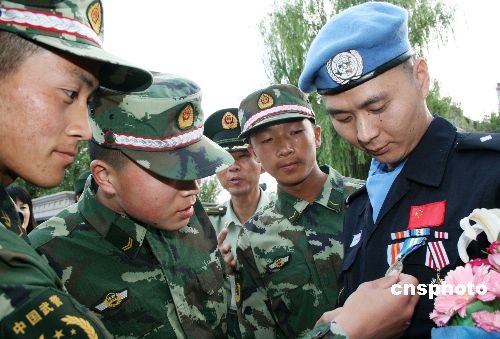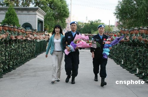 6月17日,出色完成海地維和使命的中國(guó)第七支赴海地維和警察防暴隊(duì)成員、新疆博爾塔拉蒙古自治州公安某部警官楊良、崔繼偉和李強(qiáng)載譽(yù)歸來(lái),受到了社會(huì)各界的熱烈歡迎。該防暴隊(duì)由新疆公安邊防總隊(duì)獨(dú)立組建,于2008年8月代表中國(guó)政府、中國(guó)警察遠(yuǎn)征海地,圓滿完成為期10個(gè)月的聯(lián)合國(guó)海地任務(wù)區(qū)維和任務(wù)。中新社發(fā) 杜偉 攝