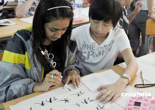7月24日,正在重慶參加“漢語橋——英國學(xué)生夏令營”的33名英國中學(xué)生在認(rèn)真學(xué)習(xí)寫漢字!肮Ψ颉、“茶”、“瓷器”等富有濃郁中國傳統(tǒng)文化的字詞,成為他們學(xué)得最快最好的漢字。由英國兒童學(xué)校和家庭部、中國國家漢語國際推廣領(lǐng)導(dǎo)小組辦公室共同主辦的“漢語橋——英國學(xué)生夏令營”20日在重慶開營。中新社發(fā) 郭晉嘉 攝