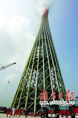 記者在現(xiàn)場所看到的與以往的消防演習(xí)完全不同:作為高層建筑滅火主力軍的數(shù)輛高噴車、云梯車、舉高車竟然原地待命,原來,著火樓層實(shí)在太高(334米),廣州云梯車最高作業(yè)高度是68米,在高達(dá)610米的廣州新電視塔底,簡直成了一個(gè)“小矮人”。而且,在建的廣州新電視塔目前尚未安裝固定消防設(shè)施,僅有一條臨時(shí)室內(nèi)消防豎管。