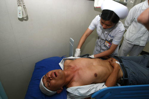 目擊于小龍被執(zhí)法人員毆打的小販林先生告訴記者,突然間4名身穿制服的執(zhí)法人員沖過(guò)來(lái)沒(méi)收東西。于小龍想從執(zhí)法人員手里搶回貨,卻換來(lái)一頓暴打!皾M臉都是血!绷窒壬f(shuō)。記者在南城醫(yī)院看到于小龍?zhí)稍诖采仙胍,頭腦還比較清醒,稱打傷他頭部的是執(zhí)法人員手持的DV機(jī)。
