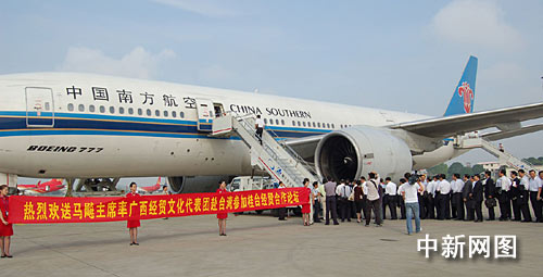 5月21日上午,廣西壯族自治區(qū)主席馬飚率領廣西經貿文化代表團乘坐包機從廣西南寧機場起飛,開始飛赴臺灣,廣西由此成為中國大陸各省、自治區(qū)、直轄市中第一個由省長級官員率團赴臺進行經貿文化交流的省份,此行也成為海峽兩岸交流史上的新突破。 馬飚率團此行赴臺是參加“兩岸產業(yè)高峰會議——2009年桂臺經貿合作論壇”,廣西經貿文化代表團人數(shù)多達1000余人,這也是大陸赴臺人數(shù)最多的參訪團。劉萬強 攝
