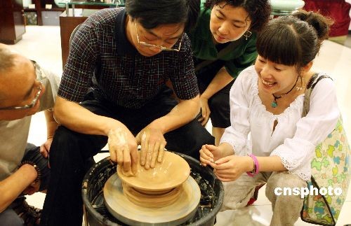 5月28日,中國傳統(tǒng)端午節(jié)之際,來自中國龍泉的青瓷陶藝大師在北京合璧興陶瓷藝術館舉行“最具有潛力的中青年青瓷大師作品展”,陶藝大師徐定昌在現場與收藏愛好者交流,F代浙江龍泉青瓷自2008年中國嘉德秋季藝術品拍賣會首次登場,2009年春季拍賣會四位大師作品將聯(lián)袂登臺,是次作品展專門展售同毛正聰大師一起來京參拍的徐定昌、陳愛明、盧偉孫三位大師的作品。中新社發(fā) 錢興強 攝