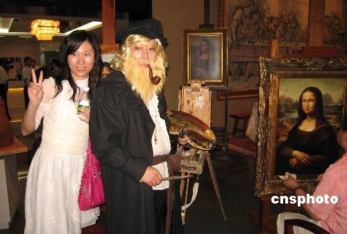 六月三日,蒙娜麗莎文化藝術(shù)館在廣東文化旅游勝地佛山西樵鎮(zhèn)啟幕。該館搜集了來(lái)自近百個(gè)國(guó)家的一千二百余件珍貴藏品,全部藏品都與《蒙娜麗莎》及其作者達(dá)·芬奇相關(guān),歷史跨度近五百年,這是中國(guó)目前唯一一座蒙娜麗莎主題文化藝術(shù)館。圖為游人在藝術(shù)館和裝扮成達(dá)·芬奇的畫家合影。中新社發(fā) 索有為 攝