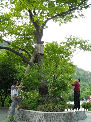 6月5日,首屆山東省棗莊市嶧城榴花節(jié)正在舉行,游客被冠世榴園青檀寺景區(qū)內(nèi)的一棵稀奇古樹吸引。該樹樹樁為棗樹,樹干以上為柿樹,被人們稱為“棗樁柿”,諧音便是“棗莊市”,更有游客看到樹根周圍環(huán)生著石榴樹,形成一個(gè)“圓”,就將這棵樹稱作“棗樁柿石榴圓”,與“棗莊市石榴園”諧音,著實(shí)有趣,每天都引來眾多游客參觀。中新社發(fā) 孔浩 攝