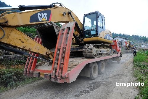 6月7日,大型救援設(shè)備駛?cè)胫貞c武隆山體垮塌現(xiàn)場。從6月6日17點(diǎn)開始,重慶市交委從渝湘高速公路建設(shè)工地調(diào)集了150余名技術(shù)骨干和20臺挖掘機(jī)、裝載機(jī)、壓路機(jī)、大型貨車,抽調(diào)武隆交通部門和沿線市民150余人及25臺大型機(jī)械設(shè)備對通往鐵礦鄉(xiāng)的28公里救援通道進(jìn)行搶修。中新社發(fā) 劉確樹 攝