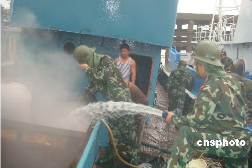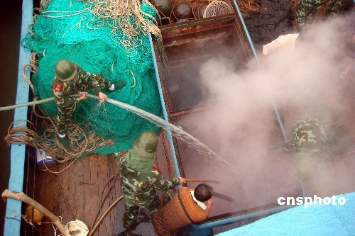 6月10日傍晚5時許,浙江省溫州市鹿西島一艘停泊在港內休漁的鋼質漁輪因電線老化引發(fā)大火,火勢迅速從中艙向外蔓延,隨時可能危及到?吭谝黄鸬20多艘漁船。發(fā)現(xiàn)險情后,鹿西邊防派出所官兵迅速攜帶滅火裝備趕赴火災現(xiàn)場救援,附近漁民也紛紛加入滅火隊伍。經(jīng)過一個多小時的奮力撲救,大火最終被完全撲滅,所幸未造成人員傷亡。中新社發(fā) 吳水斌 攝