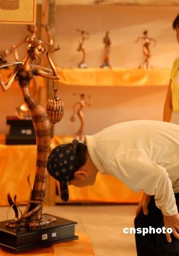 云南民族民間工藝品交易市場(chǎng)6月10日在昆明開業(yè),該市場(chǎng)占地10000平方米,是中國(guó)少有的民族民間工藝品專業(yè)交易場(chǎng)所。云南省將借助該市場(chǎng)推出木雕、青銅器、錫器等具有競(jìng)爭(zhēng)力的民族民間工藝品,做大民族文化產(chǎn)業(yè)。開業(yè)僅兩天,該市場(chǎng)已成為云南各大旅行社帶團(tuán)參觀的必經(jīng)之地。圖為6月13日,一名游客被一尊名為汲水歸來(lái)的銅像吸引,該銅像獨(dú)具傣家風(fēng)情,叫價(jià)近萬(wàn)元。中新社發(fā) 保旭 攝