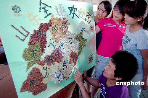 6月22日,為迎接第十一屆全運(yùn)會,山東聊城大學(xué)生命科學(xué)學(xué)院生物踐行者協(xié)會的5名大學(xué)生以山東省地圖為模板,利用黃瓜、香菜、綠豆、大米等12種種子為素材,制作成全運(yùn)會地圖。地圖上用黑米拼出了山東每個(gè)城市所承辦比賽項(xiàng)目的標(biāo)志,并用紅、黃、黑、白四色種子拼寫了“山東全運(yùn)歡迎您”的標(biāo)語。中新社發(fā) 張振祥 攝
