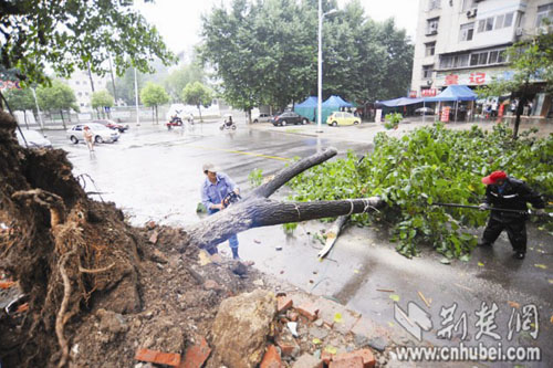記者看到,在環(huán)山路東西湖區(qū)人民醫(yī)院附近的一個拆遷區(qū),這棵茂盛的梧桐樹根部拔起,歪倒于馬路上,將整條道路截斷。來往車輛調頭繞行。在事發(fā)地對面餐館工作的王先生介紹,29日中午11時35分,正在下大雨,這棵十余米高的梧桐樹根部松動,繼而“轟”的一聲倒地。當時,兩名打著雨傘的女青年正好路過,梧桐樹的樹枝將她們的傘壓彎,兩人雖無礙,但也嚇得花容失色。