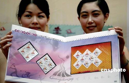 6月30日,在廣州亞運會倒計時500天之際,由第16屆亞運會組委會授權(quán)、中國郵政發(fā)行的廣州亞運會首套紀(jì)念郵票《第16屆亞洲運動會》在廣州舉行首發(fā)儀式。該套紀(jì)念郵票共兩枚,圖案分別為廣州亞運會的會徽和吉祥物,采用五色影寫版印刷方式,由中國著名郵票設(shè)計家方軍設(shè)計,畫面將嶺南文化元素與亞運元素融為一體,具濃郁嶺南氣息。中新社發(fā) 劉衛(wèi)勇 攝