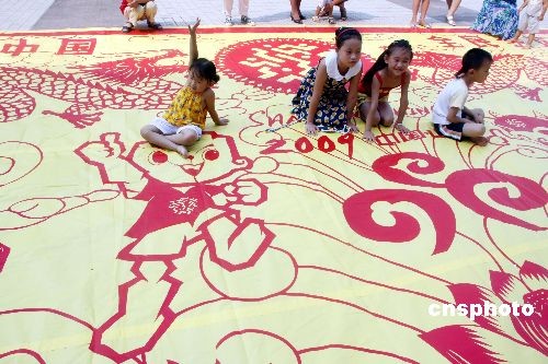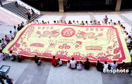 2009年7月5日,濟(jì)南剪紙藝術(shù)院的工作人員和市民在濟(jì)南市泉城廣場展示巨幅剪紙作品。當(dāng)天是第十一屆全運(yùn)會倒計時100天,濟(jì)南剪紙藝術(shù)院的120多名藝人耗時6個月,共同創(chuàng)作完成巨幅剪紙作品。據(jù)了解,該作品總面積61.6平方米,長11米(寓意第十一屆全運(yùn)會),寬5.6米(寓意56個民族),主題為和諧中國、全民全運(yùn)。作品中的圖案包含十一全運(yùn)會標(biāo)志、吉祥物泰山童子、荷花(濟(jì)南市花)、泉水等。中新社發(fā) 龔輝 攝