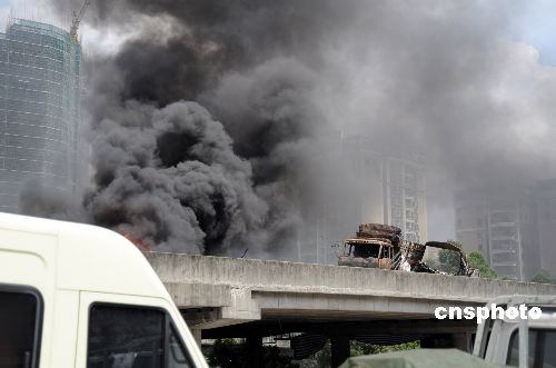 7月12日9時(shí)50時(shí)許,廣州市環(huán)城高速東圃路段,兩車(chē)相撞燃燒。車(chē)子燃燒的火苗有3米多高,該市環(huán)城高速東圃路段同方向車(chē)輛被堵近5公里長(zhǎng)。據(jù)高速橋下一位洗車(chē)師傅說(shuō),兩車(chē)是同相行駛,相撞時(shí)間大概是凌晨3點(diǎn)左右,先是一輛貨車(chē)燒著了,到上午9時(shí)許,另一車(chē)接著燃燒。10時(shí)59分,消防車(chē)趕到事發(fā)現(xiàn)場(chǎng)展開(kāi)援救。截止發(fā)稿時(shí)間,大火已被撲滅,人員傷亡情況正在調(diào)查中。中新社發(fā) 陸建東 攝