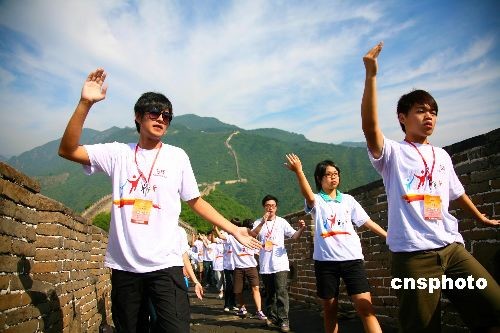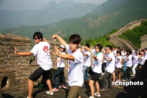 7月15日,兩岸青少年正在北京懷柔慕田峪長(zhǎng)城舞太極。當(dāng)日,北京市人民政府臺(tái)灣事務(wù)辦公室與懷柔區(qū)人民政府在懷柔慕田峪長(zhǎng)城舉辦“兩岸青年舞動(dòng)太極聚長(zhǎng)城”活動(dòng),臺(tái)灣大學(xué)、臺(tái)中技術(shù)大學(xué)、基隆市二信中學(xué)、嘉義東石學(xué)校、新竹中信學(xué)校等院校的學(xué)生,國(guó)民黨青年發(fā)展基金會(huì)、臺(tái)灣工藝發(fā)展協(xié)會(huì)等社會(huì)團(tuán)體組織成員,與北京600余名師生歡聚長(zhǎng)城共舞太極。本次活動(dòng)是“青春牽?jī)砂,十年大聚首——京臺(tái)青少年交流周”活動(dòng)重要組成部分,旨在發(fā)揚(yáng)中華民族傳統(tǒng)文化,聯(lián)絡(luò)兩岸師生感情,讓長(zhǎng)城見證兩岸青少年的友情地久天長(zhǎng)。中新社發(fā) 卜向東 攝