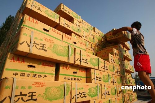 7月24日,新疆特產(chǎn)哈密瓜在北京新發(fā)地農(nóng)貿(mào)市場(chǎng)熱銷。時(shí)至盛夏,新疆的各色水果正陸續(xù)成熟,在當(dāng)?shù)毓r(nóng)喜迎豐收的同時(shí),相關(guān)政府部門(mén)采取措施幫助他們打開(kāi)銷路。7月21日,國(guó)家商務(wù)部和新疆維吾爾自治區(qū)政府在烏魯木齊組織召開(kāi)“新疆農(nóng)產(chǎn)品產(chǎn)銷對(duì)接洽談會(huì)”,來(lái)自廣東、北京等地的19家大型農(nóng)產(chǎn)品批發(fā)零售企業(yè)與當(dāng)?shù)毓⿷?yīng)商及生產(chǎn)基地簽訂近40萬(wàn)噸的采購(gòu)協(xié)議。中新社發(fā) 富田 攝