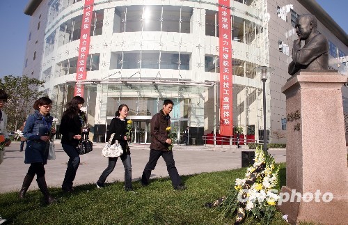 11月3日下午,中國目前最具實力的空間技術(shù)及其產(chǎn)品研制基地、人造衛(wèi)星和神舟飛船的“搖籃”——中國空間技術(shù)研究院在北京航天城舉行儀式,深切緬懷該院老院長、“中國航天之父”錢學(xué)森。正在中國空間技術(shù)研究院就讀研究生的航天青年學(xué)子們面朝錢學(xué)森塑像列隊肅立默哀一分鐘,向錢老塑像敬獻(xiàn)花籃,隨后依次手持黃、白菊花敬獻(xiàn)錢老塑像并鞠躬致敬。中新社發(fā) 孫自法 攝