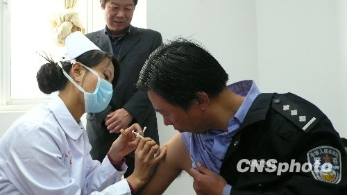 2009年11月5日,安徽省亳州市一線公安干警正在接種甲型流感疫苗。當(dāng)日,在安徽省亳州市第一批52500劑甲型流感疫苗開(kāi)始接種,據(jù)市衛(wèi)生部門(mén)負(fù)責(zé)人介紹,因?yàn)橐呙绲臄?shù)量有限,按照省里計(jì)劃,這批疫苗的接種重點(diǎn)人群是,中小學(xué)教師和學(xué)生、公安干警、交通運(yùn)輸部門(mén)工作人員、殯葬工作人員,還有醫(yī)療衛(wèi)生部門(mén)的臨床一線和公共衛(wèi)生人員等。對(duì)于這批甲型流感疫苗,亳州市衛(wèi)生部門(mén)還確定了專(zhuān)門(mén)人員,確保對(duì)重點(diǎn)人群進(jìn)行接種。中新社發(fā) 劉勤利 攝