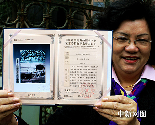 在2009年12月底,這幅畫送權威機構北京中博文物檢測鑒定中心鑒定,經(jīng)資深文物鑒定專家陳行一先生鑒定,確認為徐悲鴻大師的真跡。陳行一在鑒定意見中還寫道:“劉夫人亦屬豬,是圖繪一家子豬,肥肥胖胖,相依相偎,富貴滿堂。形體結構、透視比例準確,水墨淡色十分到位,形態(tài)逼真。背景敷以湖蕩水草,筆觸簡練,不愧為大師之作。畫家作豬十分罕見,彌足珍貴!