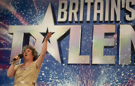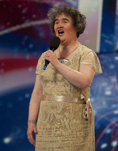 英國(guó)大嬸級(jí)歌手蘇珊·鮑以爾,當(dāng)?shù)貢r(shí)間24日晚間以動(dòng)人歌聲演唱音樂(lè)劇“貓”主題曲“回憶”,贏得評(píng)審及現(xiàn)場(chǎng)觀眾滿堂彩,挺進(jìn)獨(dú)立電視臺(tái)(ITV)選秀節(jié)目“英國(guó)有人才”決賽。圖為4月蘇珊大嬸參加《英國(guó)達(dá)人》節(jié)目的資料圖片。