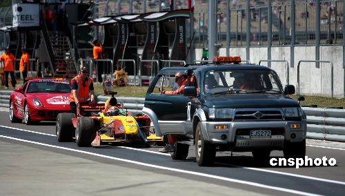 1月25日,在新西蘭陶波,A1世界杯汽車大獎賽2008/09賽季第四站第二日比賽舉行。中國隊車手程叢夫參賽,在比賽接近尾聲時,中國隊賽車發(fā)生意外,被拖車拖回維修站,所幸選手沒有受傷。中新社發(fā) 李凌昊 攝