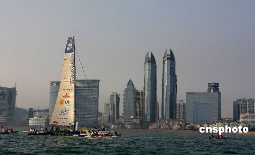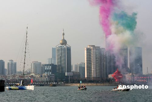 1月29日下午,作為沃爾沃環(huán)球帆船賽青島站的冠軍賽船西班牙電訊藍隊率先抵達青島。青島站組委會舉行了盛大的歡迎和頒獎儀式。中新社發(fā) 李東升 攝