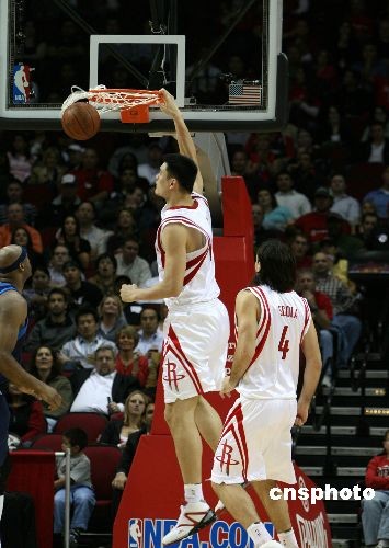 當(dāng)?shù)貢r(shí)間二月二十日晚,NBA火箭隊(duì)在休斯頓主場(chǎng)迎戰(zhàn)小牛隊(duì),以93比86逆轉(zhuǎn)獲勝。中國(guó)球員姚明拿下了22分13個(gè)籃板。圖為姚明扣籃得分。中新社發(fā) 歐文 攝