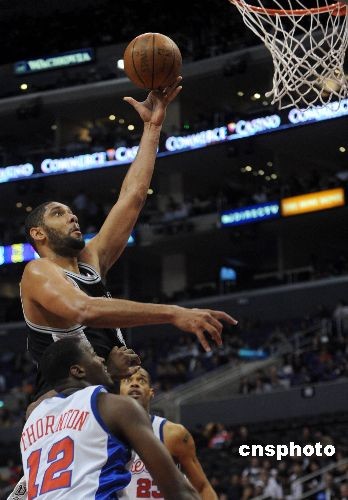 NBA勁旅圣安東尼奧馬刺隊(duì)三月二日晚在客場迎戰(zhàn)洛杉磯快船隊(duì),結(jié)果以106比78大勝主隊(duì),馬刺隊(duì)大前鋒鄧肯全場獨(dú)得16分。中新社發(fā) 張煒 攝