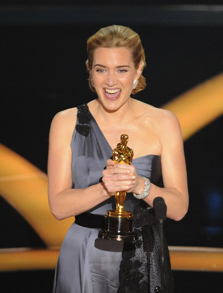 中新網(wǎng)2月23日電 美西時間2月22日下午17:00(北京時間2月23日上午9:00),第81屆奧斯卡金像獎頒獎典禮在洛杉磯柯達劇院舉行,當年在《泰坦尼克號》中飾演“露絲”一角而紅遍全球的女星凱特·溫斯萊特,今日第六次沖擊奧斯卡終于得償所愿。她憑借在《朗讀者》中的精湛演技而獲得第81屆奧斯卡最佳女主角,這位女星上臺領獎激動萬分,她說在八歲的時候曾經(jīng)想象這一時刻,當時的獎杯只是一個香檳杯子!拔乙兄x我的家人,所有人。我不能忘記你們。我很幸福,擁有一個愛我的丈夫和漂亮的孩子!