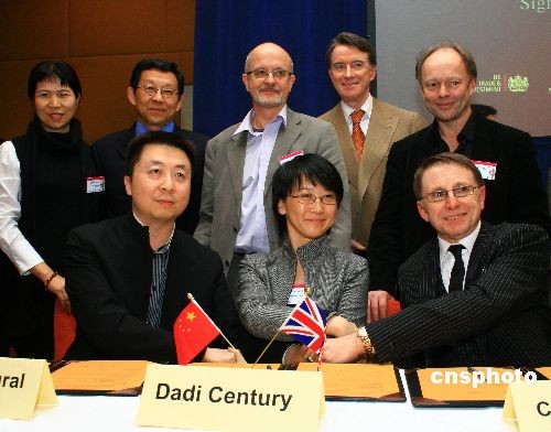 當?shù)貢r間2月27日下午,中國商務(wù)部長陳德銘(后左二)和英國商業(yè)、企業(yè)和制度改革大臣曼德爾森(后右二)共同見證了中英企業(yè)合拍電影《楊貴妃》的簽約儀式。圖為北京春秋鴻文化投資有限公司、大地時代文化傳播(北京)有限公司與英國Capital Music公司的代表簽署1400萬美元合拍協(xié)議。中新社發(fā) 李鵬 攝