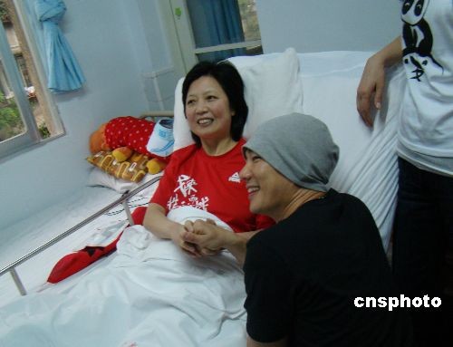 汶川大地震一周年之際,香港華光功德會(huì)愛(ài)心大使任賢齊、琦琦、汪詩(shī)詩(shī)一行于5月7日中午來(lái)到四川省人民醫(yī)院,探訪了仍然留院療傷的傷患者,并與地震傷員一起唱歌、游戲,還親手參與了“十字繡”等手工藝品的制作。此外,3人還一口氣簽下了65件愛(ài)心T恤,共同為地震傷員發(fā)起的“心啟程”活動(dòng)儲(chǔ)備愛(ài)心基金。圖為明星們到病房慰問(wèn)傷員。中新社發(fā) 王萌 攝