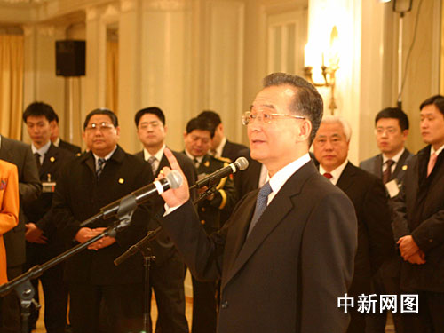當?shù)貢r間一月二十七日晚,正在瑞士進行正式訪問的中國總理溫家寶在下榻飯店會見了中國駐瑞士使館工作人員、華僑華人代表等。溫家寶坦陳中國經(jīng)濟形勢,并重申中國應對國際金融危機的信心。中新網(wǎng)記者 張朔 攝