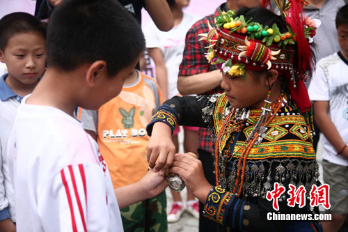 記者在現(xiàn)場看到,來自臺灣阿里山鄉(xiāng)達(dá)邦國小和屏東縣泰武國小的28名小朋友,為遭受“5.12”地震的北川羌族民眾戴上平安珠手鏈。來自臺灣屏東縣三地門鄉(xiāng)的王蕓說,希望平安珠能保四川災(zāi)區(qū)羌族人民平安。北川羌族民眾為參訪團(tuán)代表敬獻(xiàn)了羌紅,將平安送給臺灣“8.8”風(fēng)災(zāi)少數(shù)民族人民。