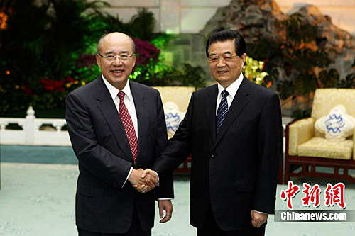 中新網(wǎng)北京7月12日電(記者 劉舒凌)12日下午17時(shí)30分許,中共中央總書記胡錦濤在北京釣魚臺(tái)會(huì)見率團(tuán)出席第六屆兩岸經(jīng)貿(mào)文化論壇的中國(guó)國(guó)民黨榮譽(yù)主席吳伯雄。(完)