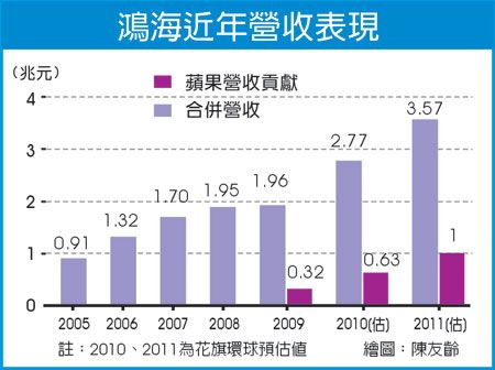張凱偉更預(yù)估,蘋果占鴻海營收貢獻,將從2009年的3200億元成長至2010年的6300億元,2011年則上看1兆元,因此,除非競爭對手能將生產(chǎn)蘋果產(chǎn)品的員工人數(shù)拉高3倍,否則將難以撼動鴻海的主導(dǎo)地位。