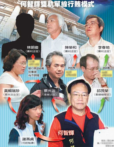 何智輝與高院法官蔡光治是多年好友,何智輝的秘書(shū)謝燕貞和蔡光治的女友黃賴瑞珍更是20多年前幼教工作的同事;板橋地檢署主任檢察官邱茂榮則因曾在苗栗地檢署做過(guò)主任檢察官,與當(dāng)過(guò)苗栗縣長(zhǎng)的何智輝早已熟識(shí)。何智輝于是運(yùn)用兩個(gè)女人當(dāng)中間人,再利用司法官之間同學(xué)、同事情誼,各自對(duì)承審法官行賄。