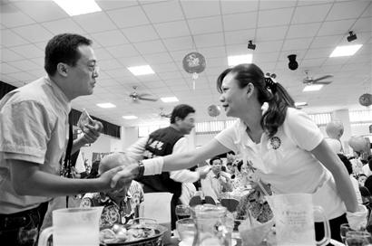 給記者記憶深刻的是,一直在我們身邊默默坐著的一對盛裝夫婦,他們入座后就默默坐著,吃了兩三樣菜后,突然聽到司儀說:“請郭添財?shù)娜。”我身邊的旗袍女士帶著微笑,款款走上舞臺,拿起話筒開始說著洋洋灑灑的祝福語,然后話鋒一轉:請給專業(yè)、認真、負責的郭添財博士一個機會,給我們支持,好不好!我這才反應過來,身邊這對夫婦竟然是大臺南市長候選人郭添財?shù)娜缛。郭家三嫂講完后,回到我們這一圓桌,舉杯和我們喝了口酒,然后從包里拿出郭添財?shù)拿纸o同桌的人,名片上包括郭添財?shù)膫人照片、從政簡介、競選口號和各種聯(lián)絡方式。分完名片,說完拜托的話,他們就站起來說:“我們要先走了,還要去趕下一場!