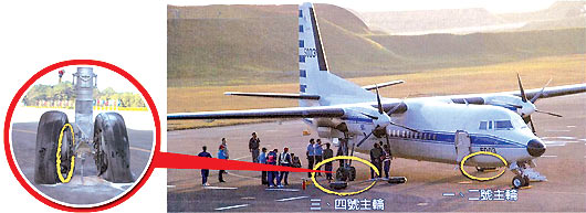 2009/11/01 FK-5003執(zhí)行馬英九座機(jī)任務(wù),在臺(tái)中清泉崗基地落地后滑行,右主輪煞車盤過熱,導(dǎo)致來令片及輪胎損傷熱熔并冒煙起火。