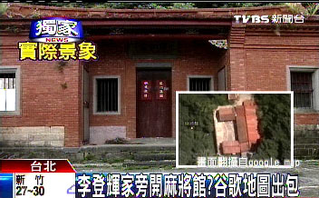 中新網(wǎng)8月3日電 谷歌地圖(google earth)在臺灣又惹上麻煩事,繼之前拍到窗臺裸女及路口“尿尿男”后,日前有民眾在谷歌地圖上發(fā)現(xiàn),李登輝的住家“翠山莊”旁邊有一間“麻將館”,誰知警察前往調(diào)查時,卻發(fā)現(xiàn)被標(biāo)為“麻將館”的地方其實(shí)是空置的三合院。
