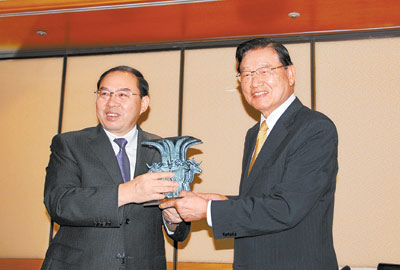 8日中午,;鶗(huì)董事長(zhǎng)江丙坤在臺(tái)北會(huì)見了率團(tuán)正在參加“2010年臺(tái)灣湖南周”活動(dòng)的中共湖南省委副書記梅克保一行。