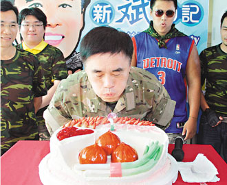 據(jù)報道,郝龍斌22日換上迷彩服與網(wǎng)友粉絲PK漆彈對戰(zhàn),同時也度過58歲生日;粉絲團特別安排了兩位女兵,送上“蔥滿勝蒜”蛋糕,象征市長選舉“充滿勝算”。郝龍斌開心許下三個愿望:第一是風調(diào)雨順,第二是希望花博圓滿成功,第三個愿望,“大家都知道,所以不說了!(應指連任成功)”