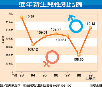 報道說,這一數(shù)字相較于2009年,19萬余名新生兒,性別比為108比100,雖然是近十年新低,卻仍高居全球男女嬰性別失衡第九高。原已稍為緩和的男女嬰比,2010年上半年卻又驟升,創(chuàng)下6年來新高!敖】稻帧敝赋,自然情況下,嬰兒出生的男女比率約在105、106比100之間。2010年女嬰特別少,性別比例失衡明顯惡化!敖】稻志珠L”邱淑媞認為,應該跟2010年適逢虎年,出生率下降有關。