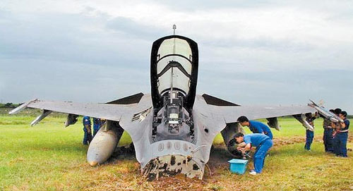 當(dāng)年6月26日機(jī)號6812的F-16B型雙座機(jī),由嘉義聯(lián)隊(duì)莊姓分隊(duì)長駕駛,后座載著“國防部”整評室副主任陳姓少將,進(jìn)行戰(zhàn)術(shù)攔截課目的熟飛,降落時,未注意跑道積水,致使戰(zhàn)機(jī)落地時,飛行員施放阻力傘后戰(zhàn)機(jī)嚴(yán)重右偏,雖然隨即拋棄阻力傘,立即使用方向舵及煞車改正偏右狀況仍無效,戰(zhàn)機(jī)降落跑道上行進(jìn)約一公里后沖向草坪,機(jī)身嚴(yán)重受損;經(jīng)評估修復(fù)戰(zhàn)機(jī),不包括發(fā)動機(jī)的修復(fù)即要花800多萬元新臺幣。